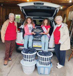 Weatherly American Legion Auxiliary Unit 360 members get ready to deliver 5 bushels of aluminum can tabs to the Geisinger Janet Weis Children’s Hospital in Danville to raise funds for projects at the hospital. From left are Carol Eroh, auxiliary member; Noelle Rambaran and Aurelia Rambaran, who is Miss Poppy; and Betty Henry, auxiliary member. The public can help with donations of can tabs, dropping them off during post home events or leaving them at the bench at the building. CONTRIBUTED PHOTO