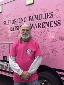 A pink truck stood with tables of merchandise supporting families and raising awareness of breast cancer. Charles Mayer, in solidarity with his girlfriend, who is undergoing cancer treatment, helped with the merchandise.