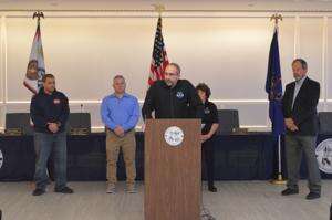 Jim Thorpe Borough Council President Greg Strubinger speaks during Tuesday’s rededication ceremony for Memorial Hall and the borough’s new municipal complex. In the background, from left, are Mayor Eric Cinicola, Council member Ted LaRizzio, Councilwoman Joanne Klitsch, and Council member Mike Yeastedt.JARRAD HEDES/TIMES NEWS
