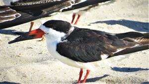 Black skimmers have bills adapted with a lower bill about 1½ inches longer than the top bill. It flies (skims) just above the surface of a bay with the longer bill just touching the surface to snatch up small minnows.