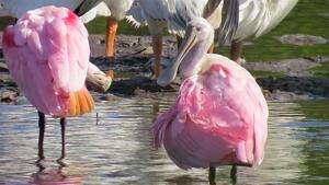 Sometimes misidentified as a flamingo, the roseate spoonbill leaves no doubt how it got its name. It uses its unusually adapted bill to probe in the silt and muck to find small crustacean food.