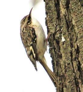 A brown creeper has a slightly downcurved bill to help it lift up loose pieces of bark as it creeps upward from low on a tree trunk to almost near the top.