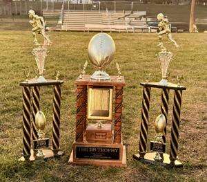 The trio of Route 209 rivalry trophies on display at the Lehighton Booster field. Lehighton’s A, B and varsity teams all defeated Jim Thorpe to sweep the rivalry. CONTRIBUTED PHOTO