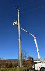 A PPL lineman goes up in a bucket to clear the wire that fell on a car.