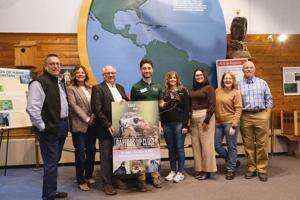 The M&T Charitable Foundation recently awarded Hawk Mountain Sanctuary a $5,000 grant to support its acclaimed weekend education programs, including the popular “Raptors Up Close” series. Shown, from left, are bank representatives Bryan Geiger, Gail D’Angelo, John Jablowski, Jody Henninger, Alexis King and Sarah Burnett, with Hawk Mountain educator Dan Jenkins, who is holding an American kestrel, and Hawk Mountain President Sean Grace, far right. M&T Bank has supported Hawk Mountain for more than 20 years, helping the sanctuary provide free, family-friendly programs that inspire people to connect with nature and learn about raptor conservation. CONTRIBUTED PHOTO