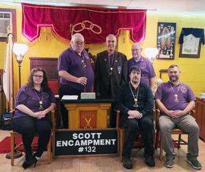 Elected patriarchs of Scott Encampment are shown, seated, from left, Senior Warden Jennifer J. Swett, Junior Warden William Oertel and Scribe Justin Bailey. At back are Chief Patriarch Andrew L. Kilmer, District Deputy Grand Patriarch James W. Sellers and outgoing Chief Patriarch Paul E. Lautenschlager. CONTRIBUTED PHOTO