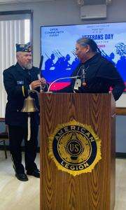Don Wild Eagle of the Wolf Clan presented an eagle’s feather to American Legion Post Commander Everett Shaver during the Veterans Day observation Tuesday at Post 927 in Gilbert.