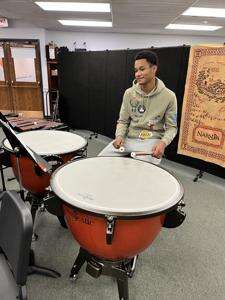 Anthony Arias-Tejeda, Class of 2028, explores the sound of MMI’s new timpani drums during music class. CONTRIBUTED PHOTO