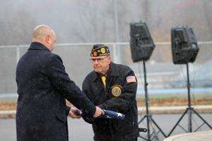 Tamaqua Area School District Superintendent Ray Kinder accepts a flag from Dale Kline of the Quakake American Legion. CONTRIBUTED PHOTO