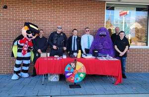 Walnutport Police recently were at the Walnutport McDonald’s for “Coffee with A Cop.” From left: the Hamburglar; Officer Scott Ledo; Officer Nick Hartman; Eddie Toro, supervisor of the areas’ McDonalds; Richard Donovan, the Experience and Engagement person for McDonald’s; Grimace; Walnutport Police Chief Jason Nothstein and John Gentile, in charge of the electronics for the event. PATRICIA INGLES/SPECIAL TO THE TIMES NEWS