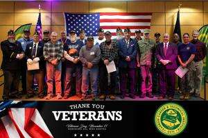 Participating in the Veterans Day ceremony at the Carbon Career & Technical Institute were: front row, from left, Keith McQuait, Stephen Berger, Robert Valusek, Dan Plesniarski, Barry Miller, Ken Reiter, Robert Sassani, William Davis and District Attorney Michael Greek, Rhina Rivera. Back row, from left, Ken Walters, Henry Woods, Jake McCloskey, William Diehm, Laverne Arndt, Nick Butrie, Wesley Hiles, Vincent Roos, Victor Brown and Michael Garrant. CONTRIBUTED PHOTO