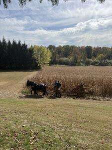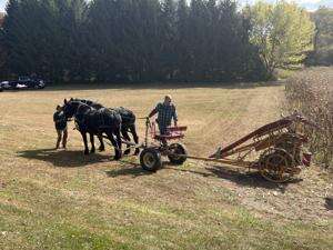 A pair of horses recently towed an antique piece of farm equipment through a cornfield in Kresgeville.