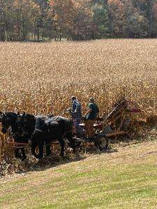 Members said that on larger farms, combines are used to select and shell corn in one pass. By the time the corn comes out of the machine, all that’s left are the kernels. The corn tastes different when using the horse-drawn tractor method compared to picking it today.