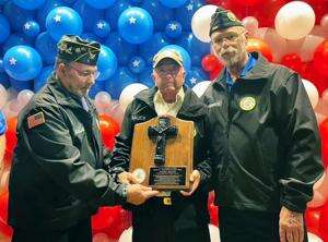 From left, Rudy Balas, commander of the Vietnam Veterans of Carbon County, presents an award to Daniel Bauer, retiring chaplain. At right is Dennis Ockenhouse, incoming chaplain. CONTRIBUTED PHOTO