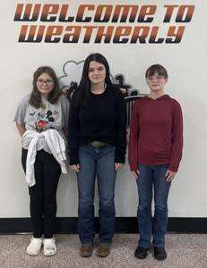 Anthony DeSpirito, Weatherly Area Middle School principal, has announced the students who were selected as Weatherly Area Middle School’s “Students of the Month” for October. The award is based on academic achievement, attendance, extra-curricular involvement, and service to school and community. Students are, from left, Ava Keating, 6th grade; Gia Jones, 7th grade; and Dinah Janiec, 8th grade.