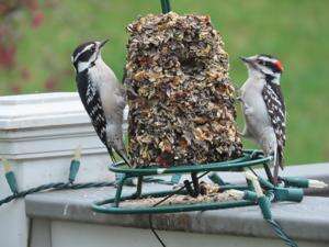BELOW: The downy woodpecker’s bill is much shorter than its head. The photo also will help you identify the male, on the right with a red head patch, and the female on the left.