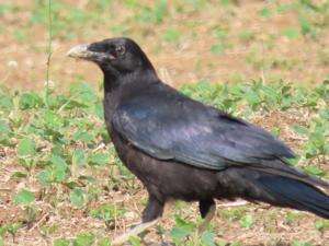 The crow has a sleeker body, a smaller bill, a different flight and the characteristic call of caw, caw.