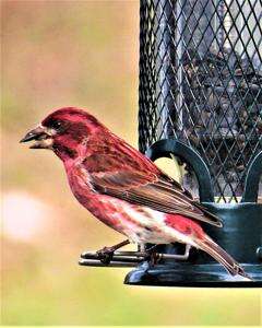 A fairly common winter visitor is the purple finch. Compare the more vibrant reddish plumage covering most of the male bird to the very common house finches in the next photo.