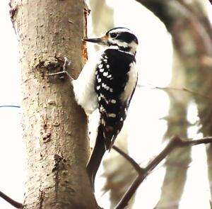 LEFT: If not seen together, it is hard to distinguish the size difference between the larger hairy woodpecker, shown here, and the more diminutive downy woodpecker. Note the best trait used to identify is the length of the bill. A hairy woodpecker’s bill is almost as long as its head.