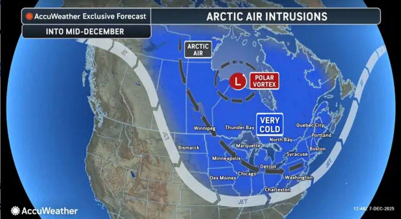 “The polar vortex has been in a weakened and stretched state since late November,” AccuWeather Lead Long-Range Meteorologist Paul Pastelok said. “We are seeing the result as Arctic air pushes southward across the central and eastern U.S. in recent days and may continue to do so for the next couple of weeks or so in waves