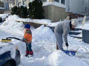Theresa Guinter and her son, Elliott Guy, 6, could be seen brushing off their vehicle and shoveling the white powder off their sidewalks in the 300 block of North Second Street in Lehighton.