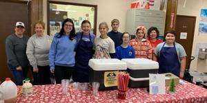A number of smoothie flavors were available from Sweet Inclusions at the Tamaqua Public Library on Saturday. The group is comprised of Tamaqua Area Middle and High school students from the Life Skills and emotional support classrooms, along with volunteers from other grades and classes. Shown here, from left, are Corinne Miller, an aide at the middle school; Ann Frohnheiser, volunteer; Hannah Murphy, middle school aide; Arabella Titus and Ella Balliet, both seventh grade students, Emma Frohnheiser, super senior who graduated in 2025, and Hayley Kerstetter, ninth grade and Sammy Snyder, seventh grade, both volunteers. At back from left, are Logan Levan, eighth grade, and Alicia Murphy, middle school special education instructor. JILL WHALEN/TIMES NEWS