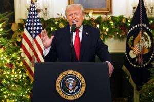 Flanked by two Christmas trees with a portrait of George Washington behind him in the White House’s Diplomatic Reception Room, Trump sought to pin any worries about the economy on his predecessor, Joe Biden.