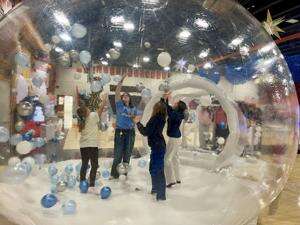 The schoolwide holiday bash featured games, glimmering winter backdrops and scenes, inflatable snowmen, penguins, Christmas trees, a photo booth, character visits and a life-size, inflatable snow globe for the kids to play inside.