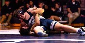 Northern Lehigh’s Dawson Newhard locks up with his opponent during last night’s match against Catasauqua. TAJ FALCONER/SPECIAL TO THE TIMES NEWS