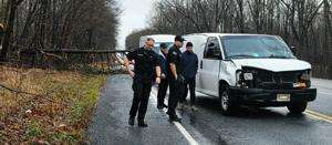 A man was injured Friday afternoon in East Brunswick Township when a large tree fell on the van he was driving. The incident occurred around 2:15 p.m. as he was westbound on Route 443 atop Clamtown Hill. Heavy winds during a storm downed the tree, which toppled onto the van and damaged the vehicle’s roof, causing a head injury to the driver. The man was treated at the scene by Tamaqua Ambulance personnel. Route 443 was closed to traffic. COPYRIGHT LARRY NEFF/SPECIAL TO THE TIMES NEWS