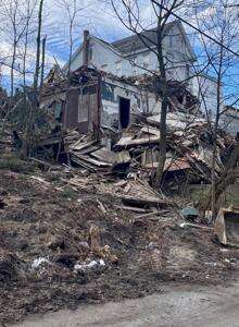 Contractors started tearing down a once towering home at 151-151 1/2 W. Ridge St. in Lansford this past week. The borough used Community Development Block Grant funding to have the home, which officials believed was in danger on collapsing into Snyder Avenue, razed. KELLY MONITZ SOCHA/TIMES NEWS