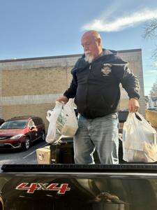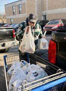 Paul Wahrmann, a member of the Pocono Mountain Harley-Davidson Ownership Group, loads bags of groceries into a shopping cart on Monday at the Salvation Army center in East Stroudsburg. The group holds a food drive each year at Christmas. CONTRIBUTED PHOTO