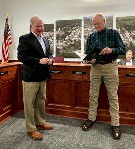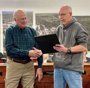 State Sen. David Argall presents retiring Weatherly Manager Harold Pudliner with an honor from the state Senate on Monday night during a borough council meeting. KELLY MONITZ SOCHA/TIMES NEWS