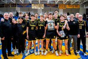 Panther Valley players and coaches celebrate with the championship plaque after capturing the Marian Christmas Tournament title Saturday. MATT BREINER/SPECIAL TO THE TIMES NEWS