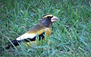 Excuse the quality of the photo, but a few years ago in early autumn, a lone male evening grosbeak fed beneath one of the feeders holding sunflower seeds. If you do see any this winter, email this writer so I can document their appearance here amid their dwindling numbers.