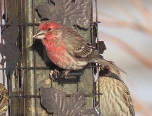 A male house finch feeds at Ken and Jill Mead’s feeder. Note the reddish plumage is basically limited to the head area, unlike the similar purple finch.