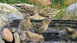 If you have thistle (Niger) feeders, check regularly, for often mixed in with the goldfinches you could find pine siskins. They aren’t as bright as the goldfinches but have streakier plumage.