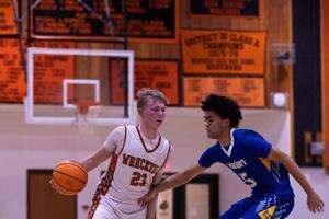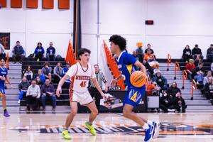 Marian’s Jacob De La Cruz looks to dribble past Weatherly’s Corbin Wagner. MASON DANNENFELSER/SPECIAL TO THE TIMES NEWS