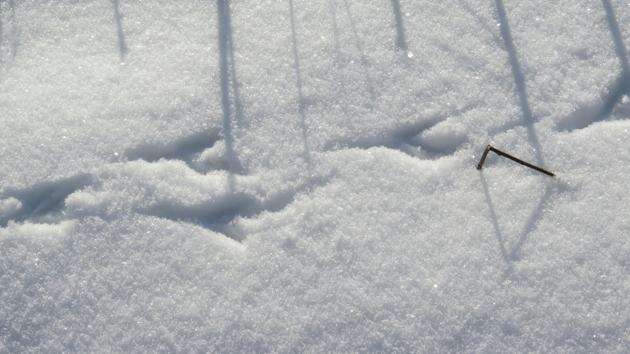 Rabbits, whose numbers seem to be dropping, cover a lot of ground each night, too. In a green briar patch you can see where they sat and nibbled off one of the green thorny canes. Sometimes I find a thorn or two in the snow where it neatly nipped them off.