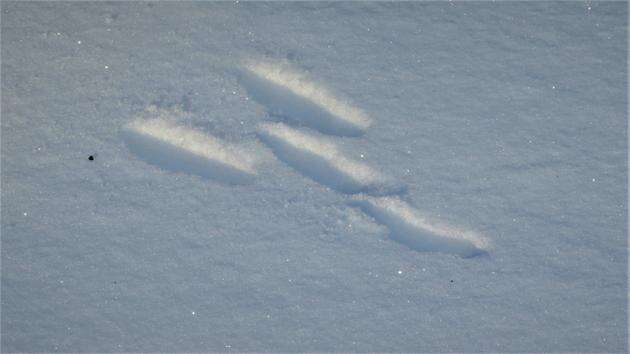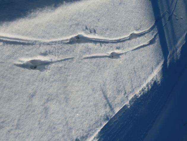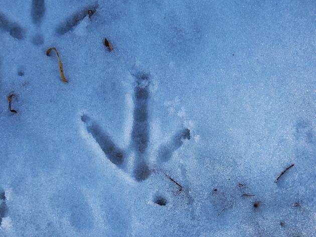 Most of the other animals are too large to travel beneath the snow. Gray squirrels make a lot of tracks in a few hours, scurrying from trunk to trunk and then stopping at a particular spot where a few leaves are now exposed on top of the snow.