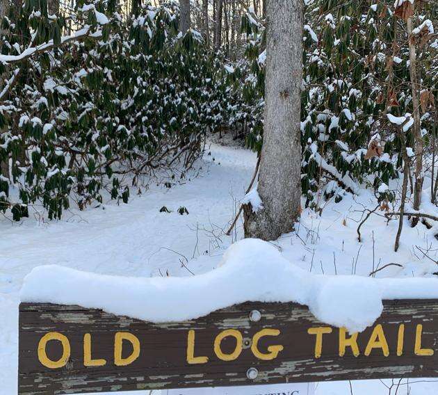 The Old Log Trail sign is decorated with snow Monday afternoon t Tuscarora State Park. JILL WHALEN/TIMES NEWS