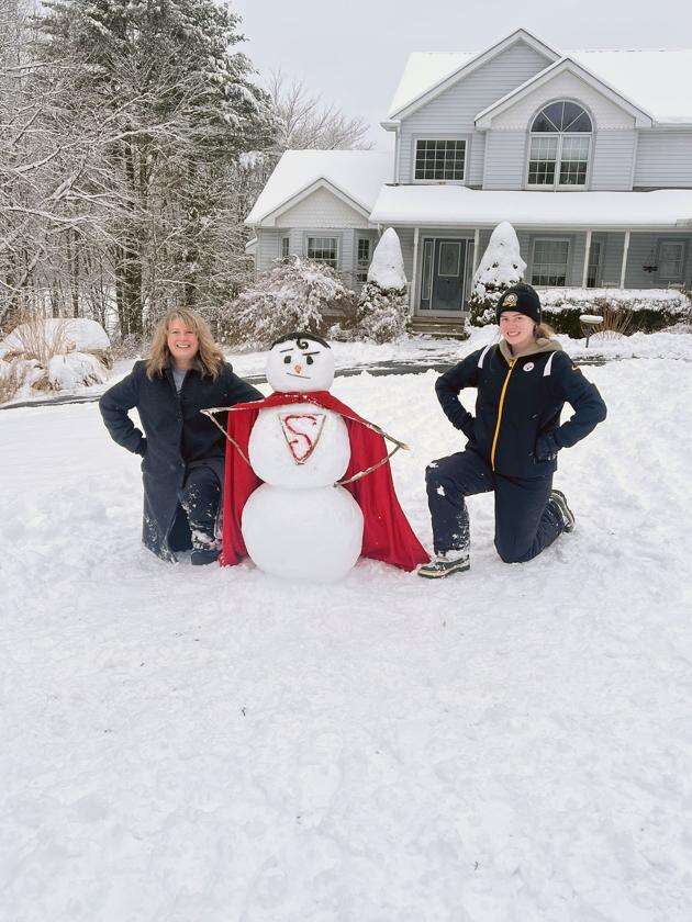A super snowman built by Valerie Szmaciasz, left, and her daughter, Hannah Szmaciasz of Kunkletown on Sunday. CONTRIBUTED PHOTO