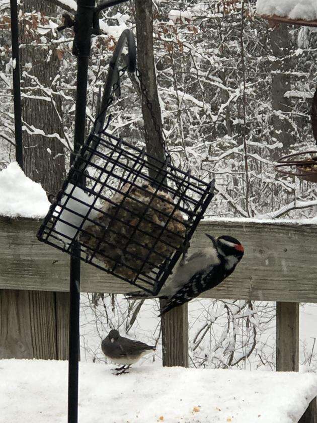 A downy woodpecker chows down on suet while a junco waits by patiently in Brodheadsville on Sunday. MARTA GOUGER/TIMES NEWS