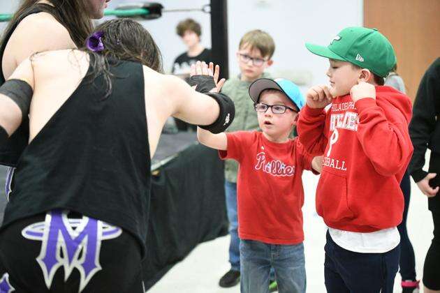 Members of the Misery Inc. tag team from New Jersey, Vi Daniels and Troy Locke, chat with fans Wyatt Krajcirik, who gets a high-five from one of the wrestlers, and Owen Lynn during the show at Summit Hill. RON GOWER/SPECIAL TO THE TIMES NEWS
