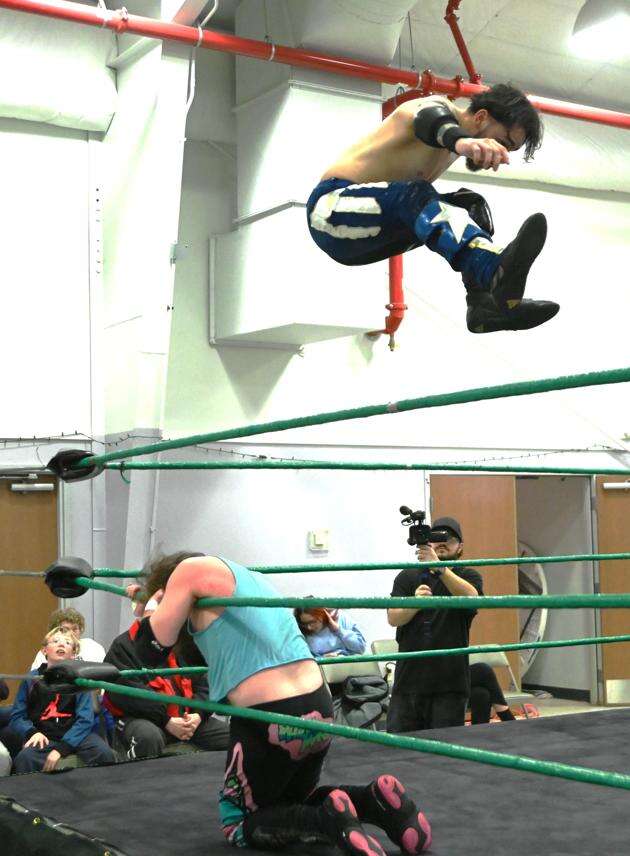 Brian Matthews soars high over Billy Mike Swanson in the ring at Summit Hill. RON GOWER/SPECIAL TO THE TIMES NEWS