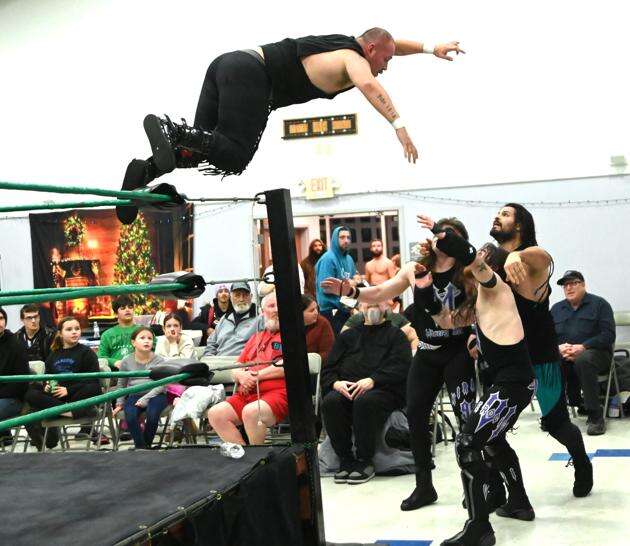 Joseph Jordan of Jim Thorpe leaps off the top rope onto other wrestlers during pro wrestling action in Summit Hill. RON GOWER/SPECIAL TO THE TIMES NEWS