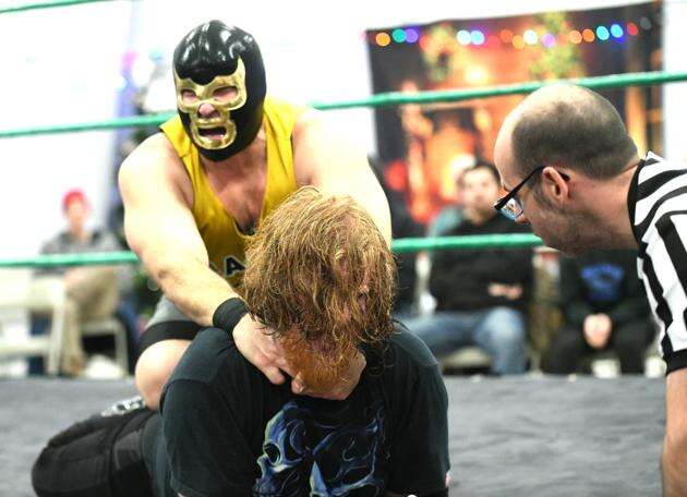 He declined to give his real name because of his occupation, but last Saturday, wearing a sparkling gold mask and cutoff T-shirt that was emblazoned in large black letters with the word “Mauler,” he was a participant in the pro wrestling show held at the Hilltop Community Center in Summit Hill.