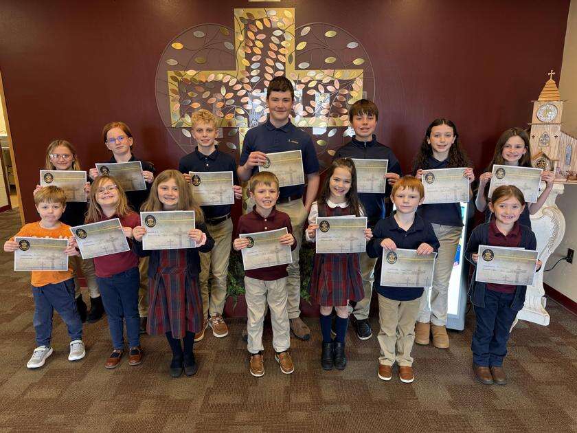 St. Jerome Regional School recently named the Christian of the Month students for January 2026. They are, front, from left, Bennett Hinkle, Preschool; Sianna Labert, Grade 2 Blue; Ava Malafarina, Grade 2 Gold; Chason Kline, Grade 1 Blue; Skye Steffy, 3rd Grade; Thomas Baddick, Kindergarten Gold; and Erin O’Gorman, Grade 1 Gold. Back row, Erin Smith, Grade 4 Gold; Robert Paton, Grade 6 Gold; Jager Yelito, Grade 6 Blue; Evrett Angelo, 8th Grade; Hunter Gerhard, 7th Grade; Layla Van Wickle, Grade 4 Blue; and Amelia Kromer, 5th Grade. Missing from photo is Knox Thompson, Kindergarten Blue. The Christian of the Month Award recognizes students who display good character on a consistent basis and serve as student role models throughout the month. CONTRIBUTED PHOTO