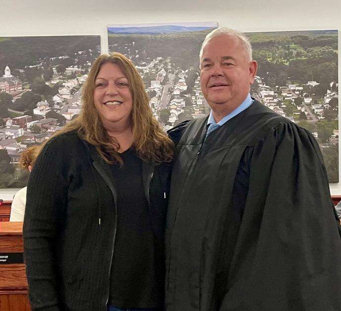 Traci Mengle stands with Weatherly District Judge Joseph Homanko after taking the oath of office Wednesday night to become Weatherly Borough Council’s newest member. KELLY MONITZ SOCHA/TIMES NEWS