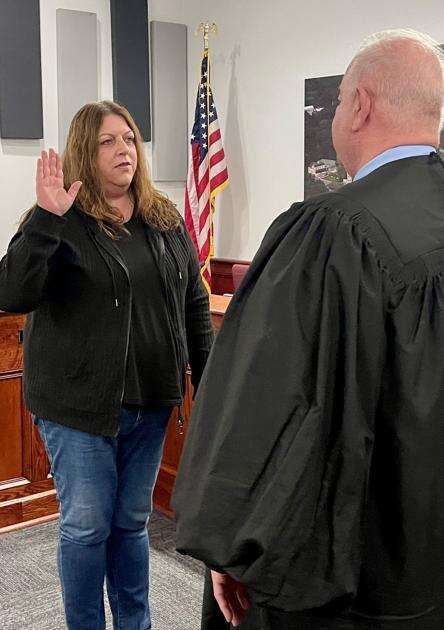 Weatherly District Judge Joseph Homanko administers the oath of office to Traci Mengle, who was appointed to Weatherly Borough Council on Wednesday night. KELLY MONITZ SOCHA/TIMES NEWS